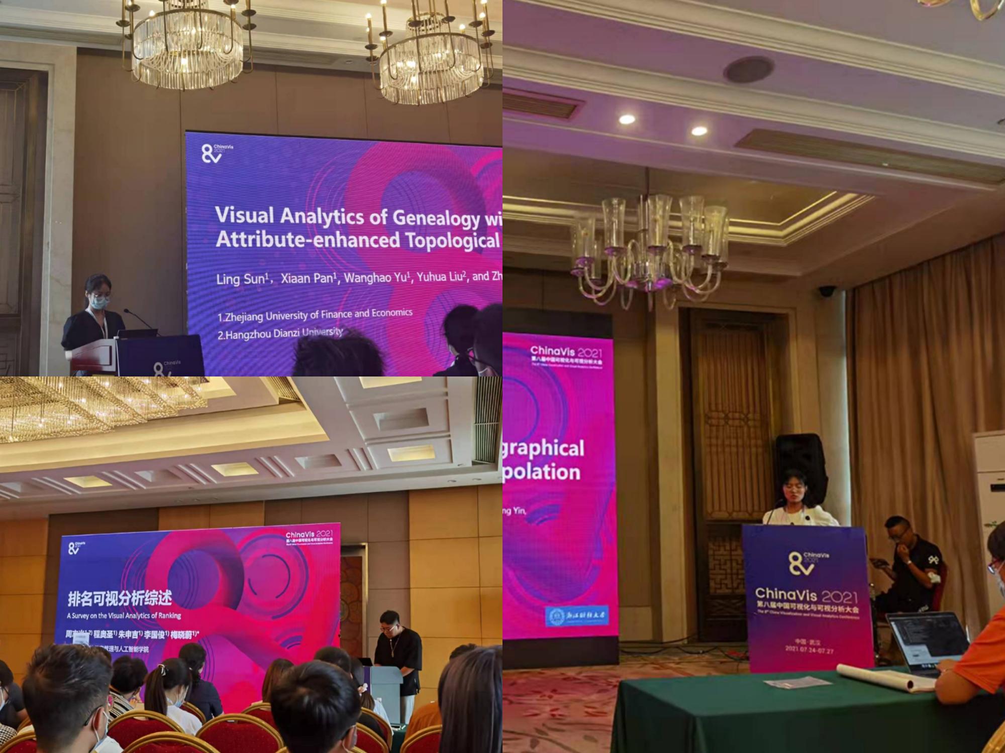 金年会教师陈伟锋、张翔、涂乐及研究生程奥圣、孙玲、郑凤玲等应邀参会。会上,金年会研究生程奥圣、孙玲、郑凤玲分别以排名可视分析综述、Visual Analytics of Genealogy with Attribute-enhanced Topological Clustering、Visual Abstraction of Large-scale Geographical Point Data with Credible Spatial Interpolation等为主题做会议报告。