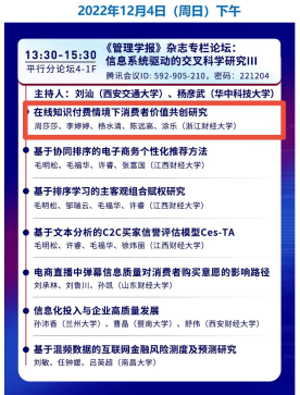 2022年12月2日至4日,由中国系统工程学会信息系统工程专业委员会(CNAIS)主办,国际信息系统协会(AIS)、中国管理现代化研究会信息管理专业委员会、中国信息经济学会、管理科学与工程学会信息系统与数字化创新分会、教育部信息管理与信息系统专业虚拟教研室支持,上海外国语大学国际工商管理学院承办的CNAIS第十届全国大会暨2022学术年会(CNAIS 2022)在线上通过腾讯会议举行。金年会20级管理科学与工程专业研究生李婷婷在“《管理学报》杂志专栏论坛:信息系统驱动的交叉科学研究”分论坛以“在线知识付费情境下消费者价值共创研究”为题进行了论文口头报告,并与参会专家学者们进行了深入的交流和讨论。