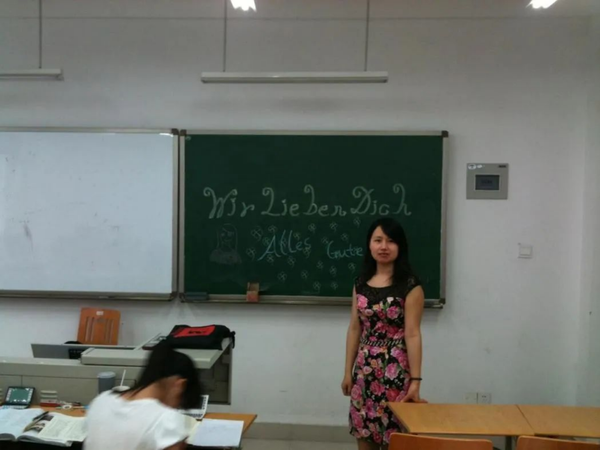 学生对冯小俐的祝福(黑板上的德语翻译为:我们爱你,祝你一切顺利!)