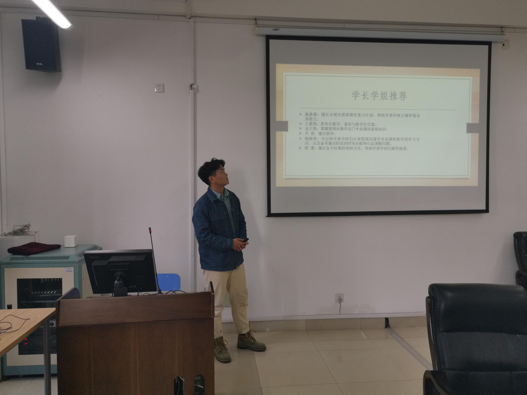 随后,金年会两位优秀的在读硕士研究生陈谦与陈洁,向大家分享了他们的考研经验。在对近年来考研难度和热度的分析后,他们详细介绍了关于数学与英语的高效的学习方法,并推荐了考研阶段中所需要的书籍。