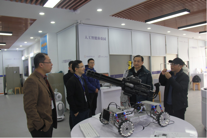随后,嘉宾一行参观了机器视觉车载防卫系统、六轴视觉机械臂等。此次参观指导,为我校开展“人工智能+经管”复合型人才培养指明了建设方向和实施路径;也为人工智能体验园的对外开放,普及人工智能教育提供了新的思路。