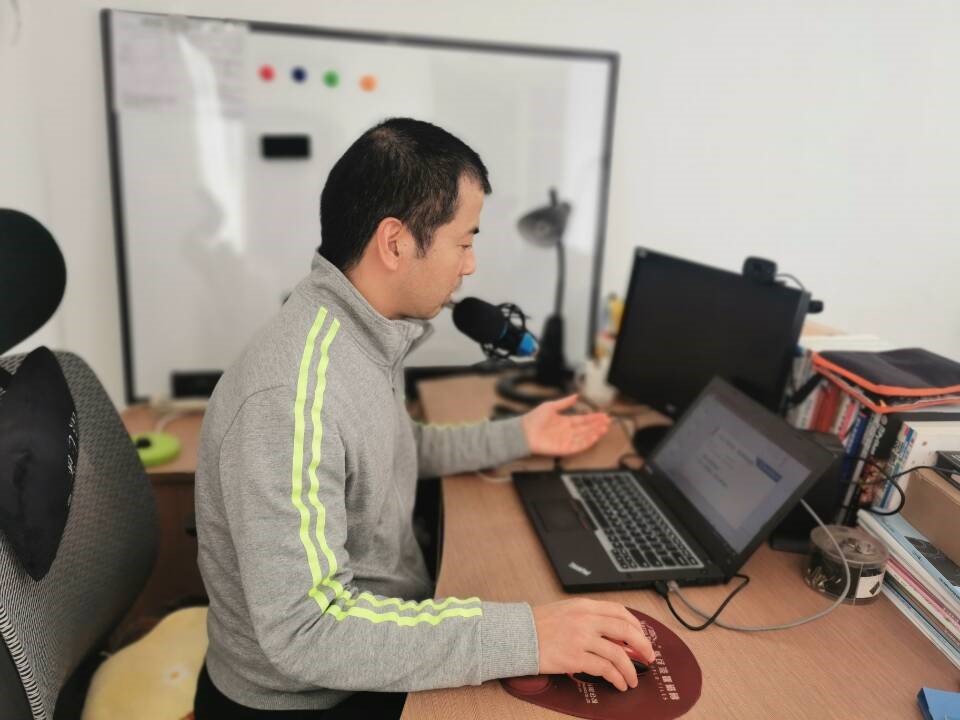 网络教学打破传统教学模式,将学习场景从线下延伸到线上,对于老师和学生都是一场考验。陈明晶老师积极参与线上网络教学培训,认真学习网络教学方法。同时与课程团队成员积极开展线上直播教学探讨,重新设计课程教学环节,优化教学流程,将教学内容进行了详细的分解定位,使课程更加契合网络教学的新形式。在直播设备的准备上,陈明晶老师也做足了功课,他将书房改造成“直播间“,增加了话筒、声卡、白板、照明设施等直播设备以提升直播效果,确保达到最好的网络教学效果。