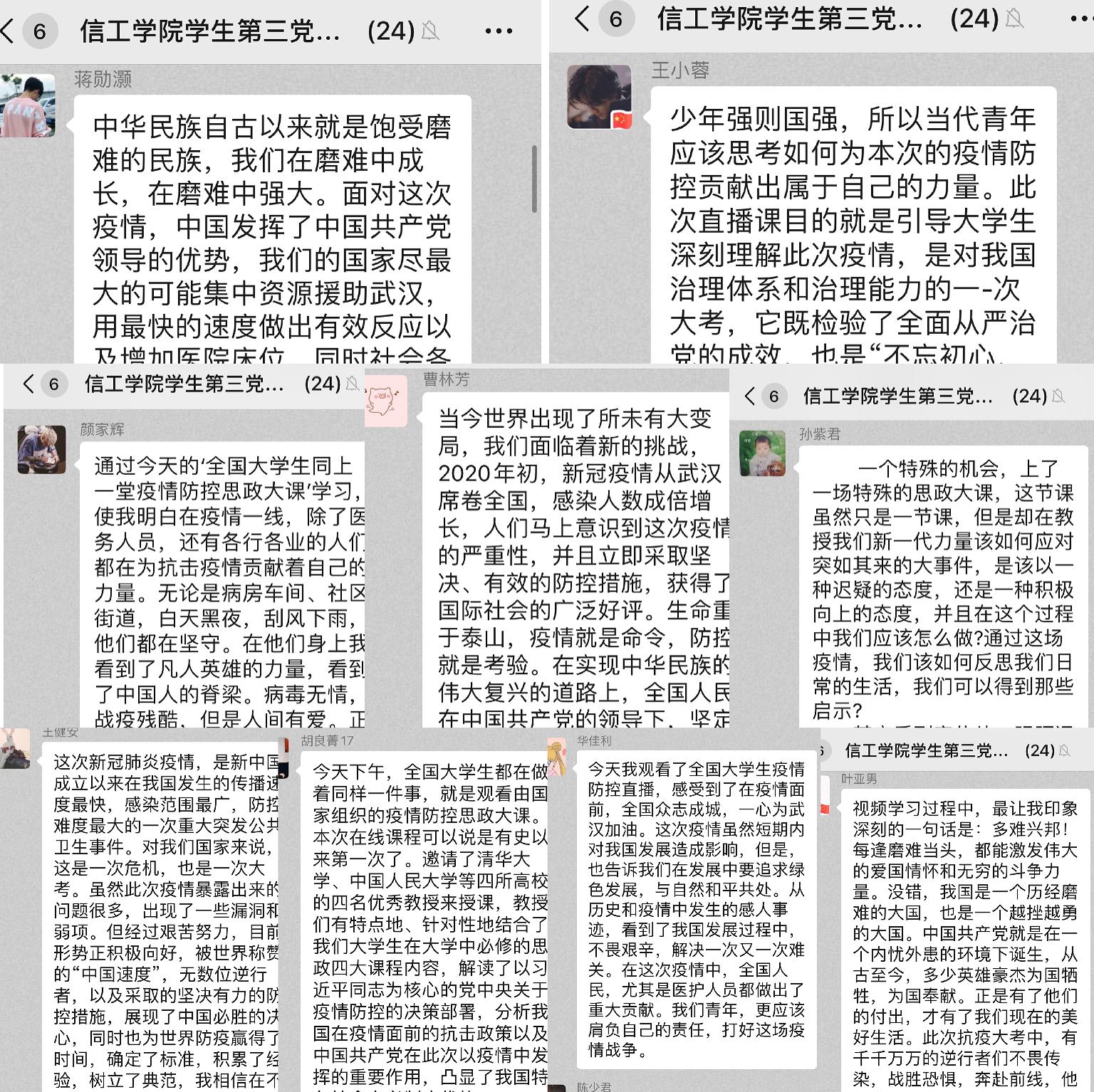 3月9日,教育部“全国大学生同上一堂疫情防控思政大课”正式开课。这节线上思政课正是在疫情防控的关键时刻,为更好引导广大学生增强“四个意识”、坚定“四个自信”、做到“两个维护”,坚定在以习近平同志为核心的党中央的坚强领导下打赢这场疫情防控阻击战的信心和决心,深刻认识中国抗疫所彰显的中国共产党领导和中国特色社会主义制度的显著优势。根据学校党委统一安排部署,信智学院党委迅速反应,广泛动员,精心组织,掀起了一股学习、交流、讨论思政大课的热潮