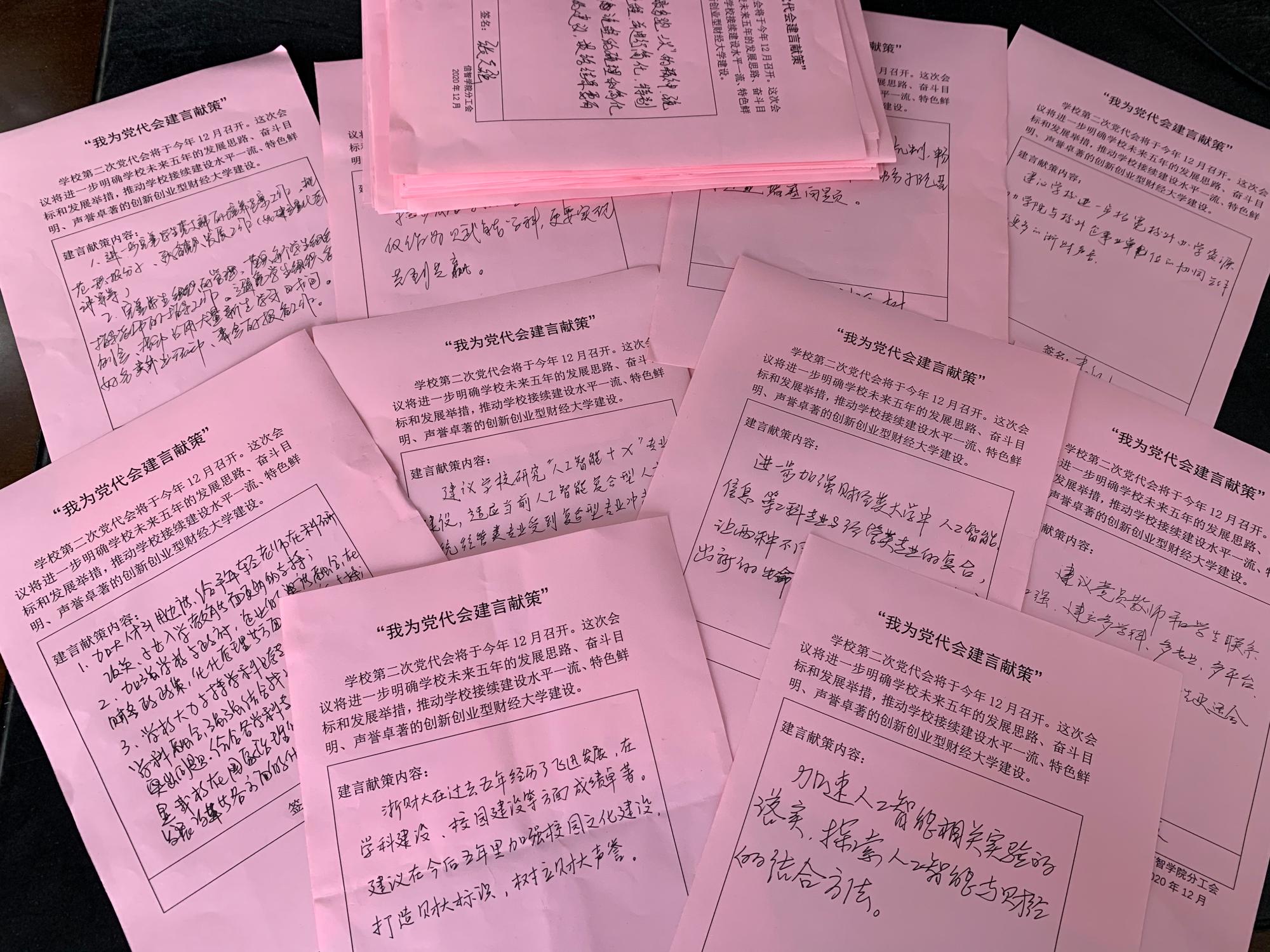 学校第二次党代会将于今年12月召开。这次会议将进一步明确学校未来五年的发展思路、奋斗目标和发展举措,推动学校接续建设水平一流、特色鲜明、声誉卓著的创新创业型财经大学建设。学院分工会组织全体老师参加“我为党代会建言献策”活动。