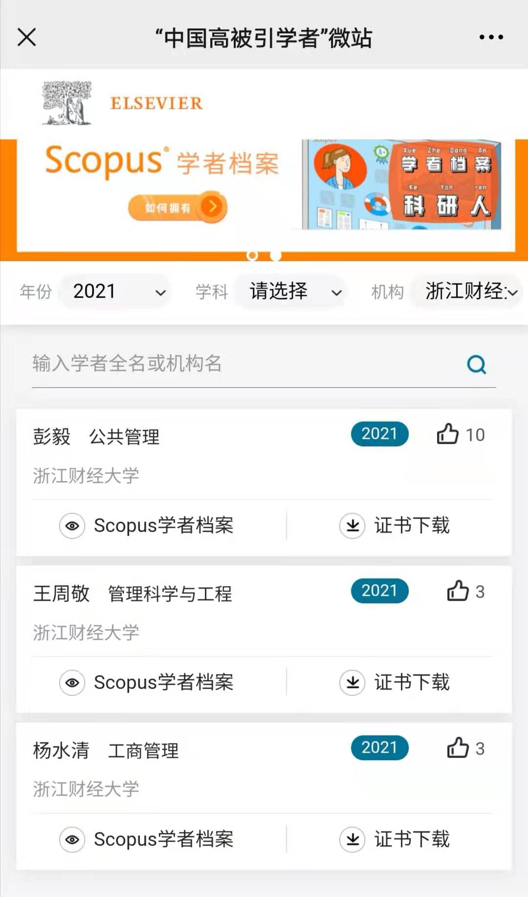 4月14日,2021爱思唯尔正式发布中国高被引学者年度榜单(Highly Cited Chinese Researchers)正式发布。金年会王周敬和杨水清两位老师入选。其中,王周敬老师已连续三年入选此榜单,杨水清老师连续两年入选。