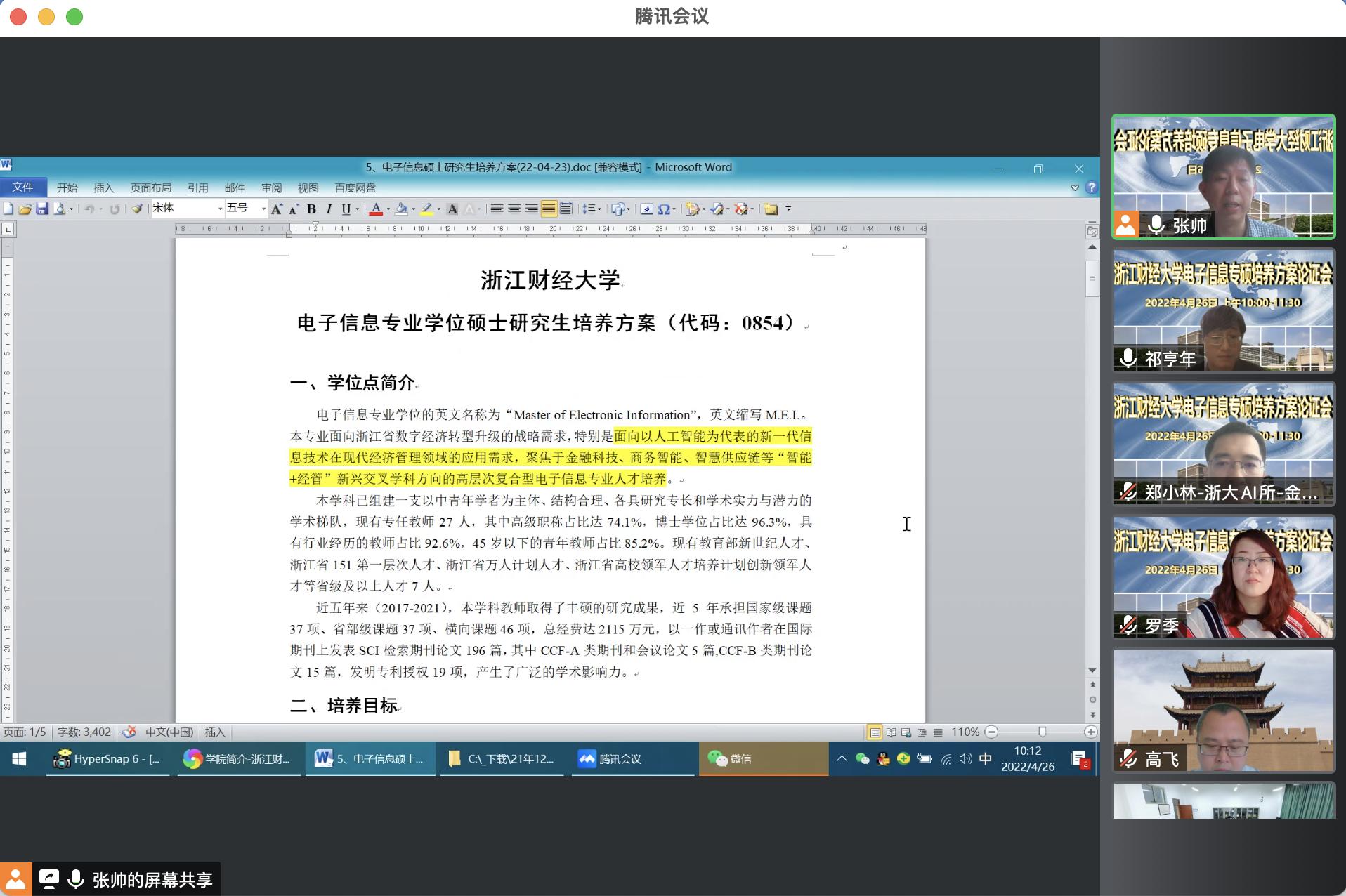 4月26日,金年会在404会议室召开了电子信息专业学位研究生培养方案线上线下同步论证会。浙江大学计算机学院郑小林教授、浙江省专业硕士教学指导委员会委员、浙江工业大学计算机学院高飞教授、浙江工商大学学科办主任杨柏林教授、湖州师范大学研究生院院长祁亨年教授、杭州电子科技大学计算机学院副院长邬惠峰教授、研究生院副院长罗季教授等专家应邀参会。本次论证会由学院院长张帅教授主持,电子信息部分骨干教师参加了会议。