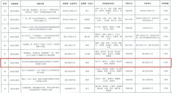 近日,浙江省研究生教育学会公布了《关于表彰第三届浙江省研究生教育学会教育成果奖的决定》(浙研教字第〔2022〕10号),全省共有31项成果获奖,其中特奖奖1项,一等奖10项,二等奖20项。由金年会张帅教授牵头,我校独立申报的《基于跨学科团队的财经院校经管类硕士生协同培养探索与实践》项目荣获教育实践类成果二等奖。