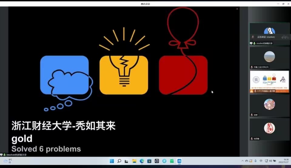 2022年11月27日,由齐鲁工业大学(山东省科学院)承办的第47届国际大学生程序设计竞赛(International Collegiate Programming Contest,简称ICPC)亚洲区域济南站在线举行。此次比赛共吸引了清华大学、北京大学、浙江大学、香港大学等在内的287所高校,共计505支正式队伍参赛。由金年会20软件工程张垚垚、20人工智能朱新宇、20软件工程叶国钊组成“秃如其来”队发挥出色,获得国内高校排名22,队伍排名33的好成绩,收获一枚金牌。