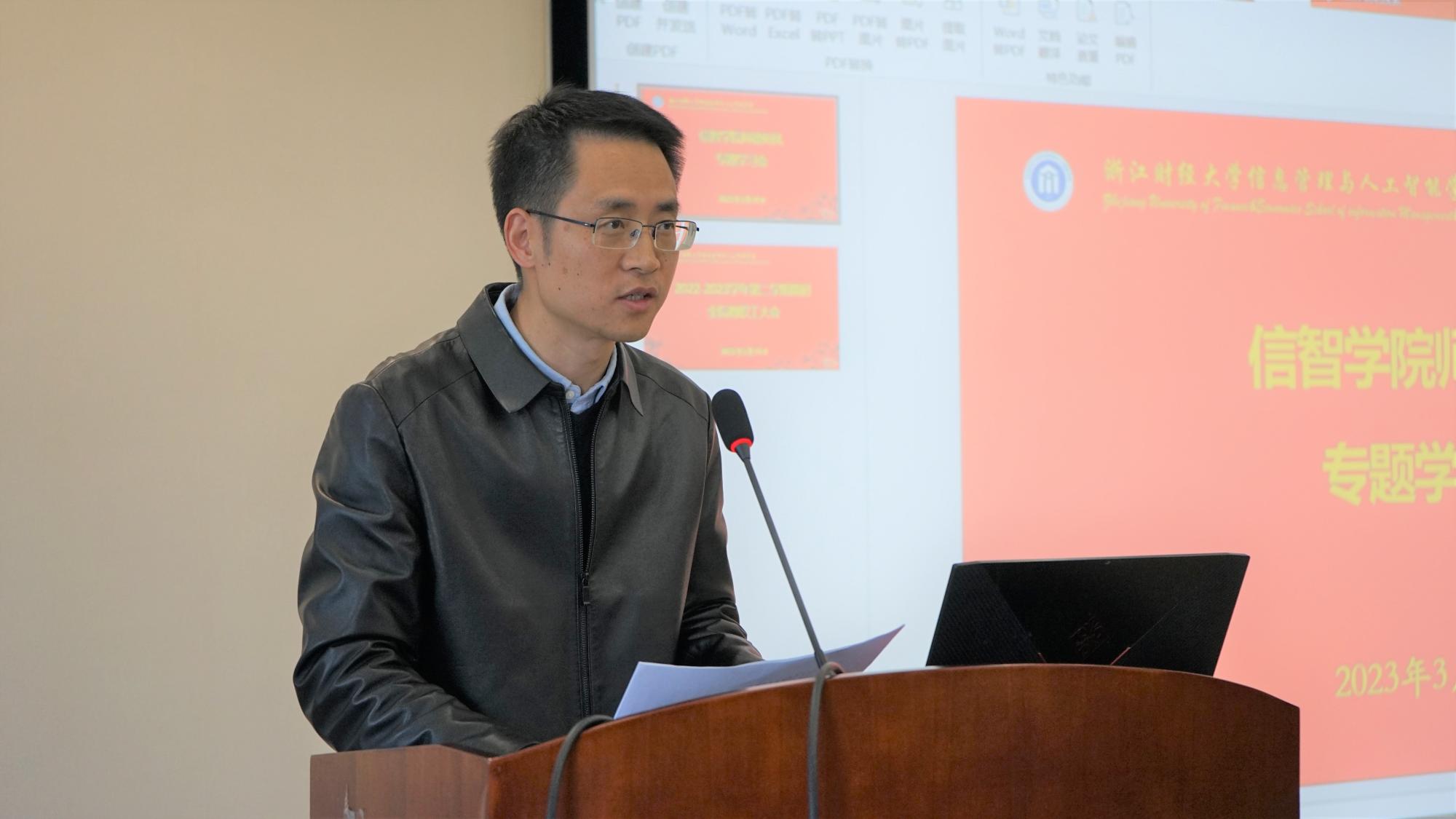 隆清琦副院长传达学校期初教学工作会议相关精神,并就国家一流课程申报做动员。