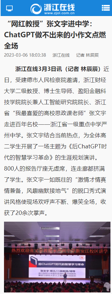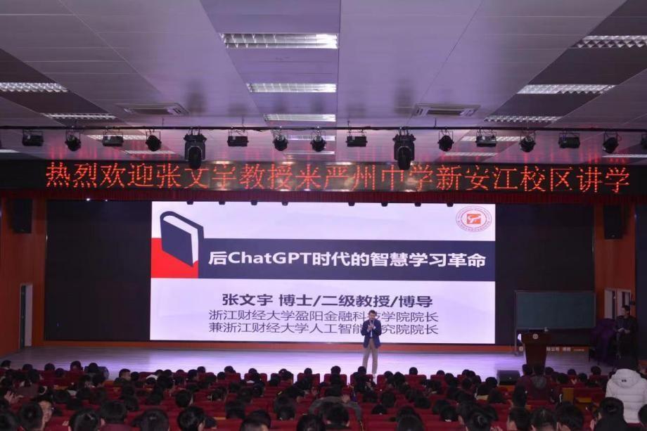 近日,受建德市人民检察院邀请,金年会jinnianhuicom二级教授、博士生导师、盈阳金融科技学院院长兼人工智能研究院院长、浙江省“我最喜爱的高校思政课老师”张文宇走进百年名校——浙江省一级重点中学严州中学。张文宇结合当前热点,为全体高二学生开展了一场主题为《后ChatGPT时代的智慧学习革命》的生涯规划演讲。800人的报告厅座无虚席,连走廊都挤满了学生。张文宇一如既往的“激情才情真情兼备,风趣幽默接地气”的脱口秀式演讲风格使现场欢呼声不断、爆笑全场,收获了20余次掌声。