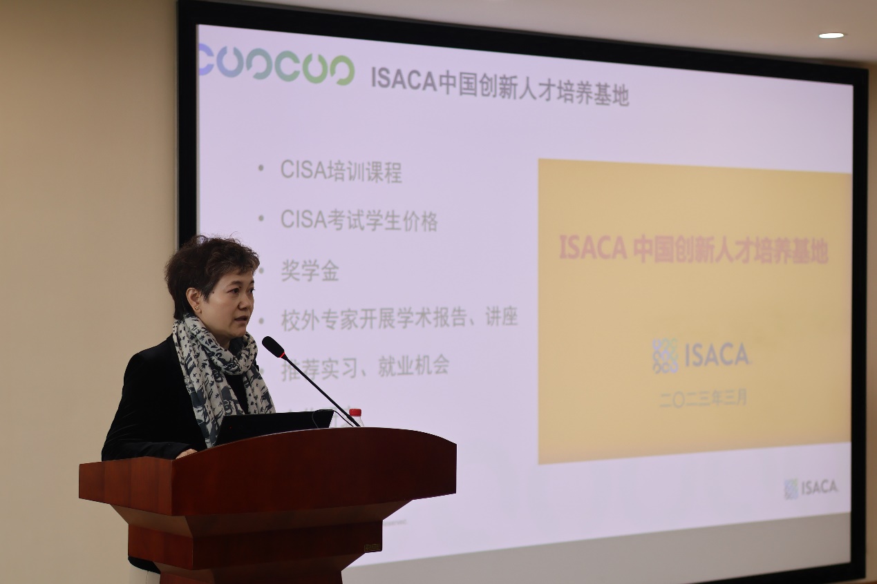 ISACA中国区首席代表陈红梅女士以“培养数字时代的复合型人才”为题致辞,ISACA是享誉全球IT专业组织、业界推崇的思想领导者、标准制定者、全球认可的专业证书颁发机构。ISACA为信息和网络安全、治理、鉴证、风险和隐私等工作领域的从业人员提供知识、证书、教育。CISA(国际注册信息系统审计师)在信智学院的教育、培训、考证等方面得到很好的开展,此次CISA授牌将更加有助ISACA中国创新人才的培养。