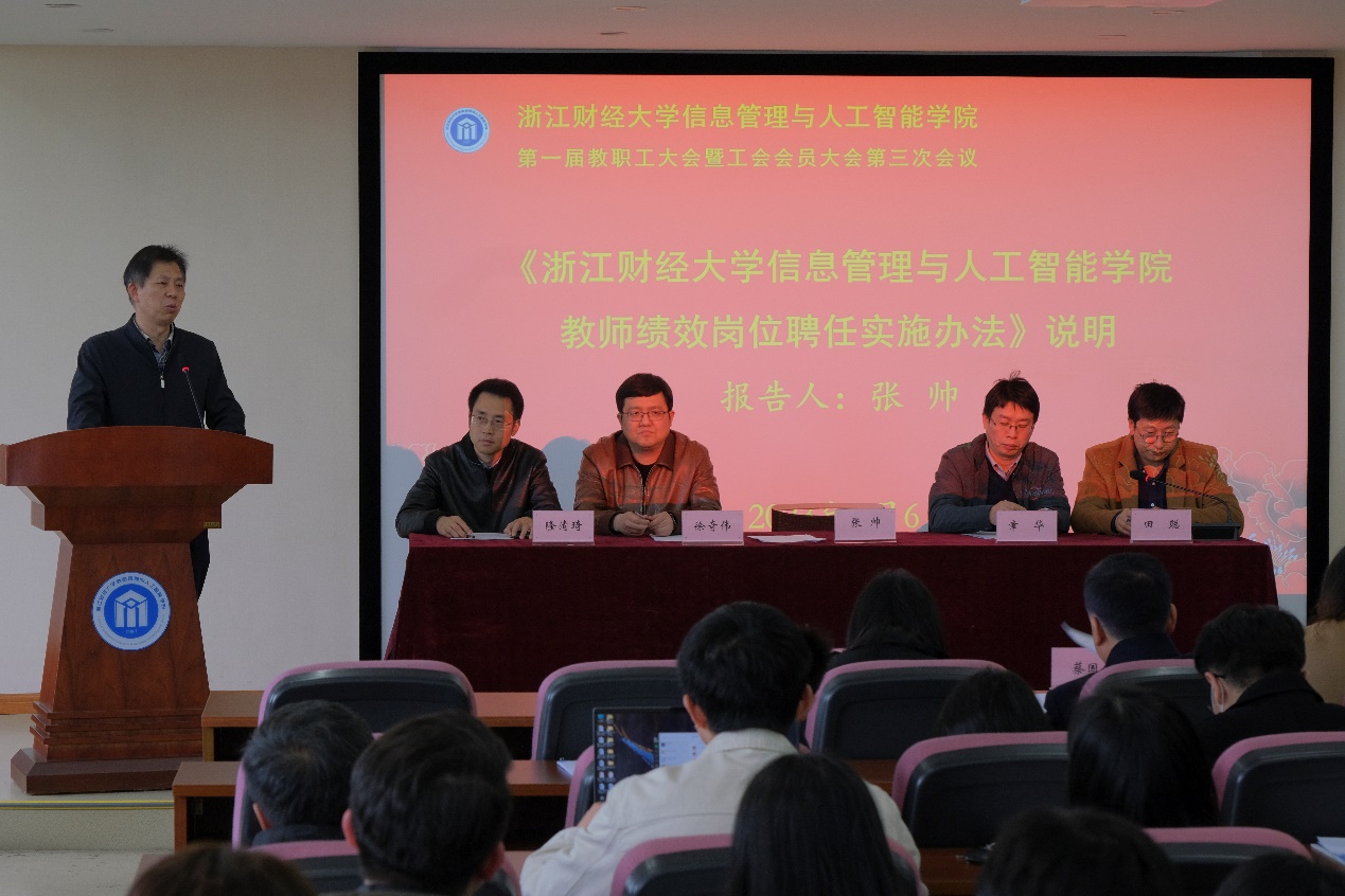 大会听取张帅院长所作的《金年会jinnianhuicom信息管理与人工智能学院教师绩效岗位聘任实施办法(草案)》说明,他从实施办法起草的目的、指导思想、基本原则、基本框架、主要内容以及办法修改过程进行了讲解。大会通过无记名投票方式,顺利审议通过了该办法。