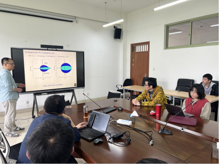 洪博士和与会老师同学展开了热烈交流,黄朝耿老师跟洪博士讨论了“机器学习与高阶算法相结合的可能性”,华教授则更加关注无线通信中OFDM多载波通信中的一般模型及优化难点,与洪博士进行了深入探讨。陈琰宏老师与洪博士、华教授交流了财经类高校人工智能专业师生的科研和学习问题。