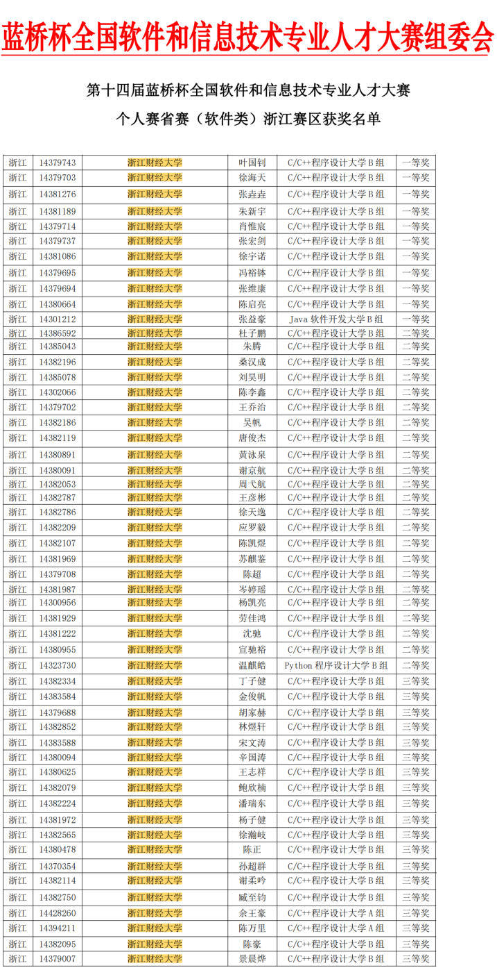 近日,由浙江省大学生科技竞赛委员会主办的第二十届浙江省大学生程序设计竞赛,与由工信部人才交流中心举办的第十四届蓝桥杯全国软件和信息技术专业人才大赛个人赛省赛分别在杭州师范大学和浙江传媒学院举行。金年会学子发挥出色,取得好成绩。