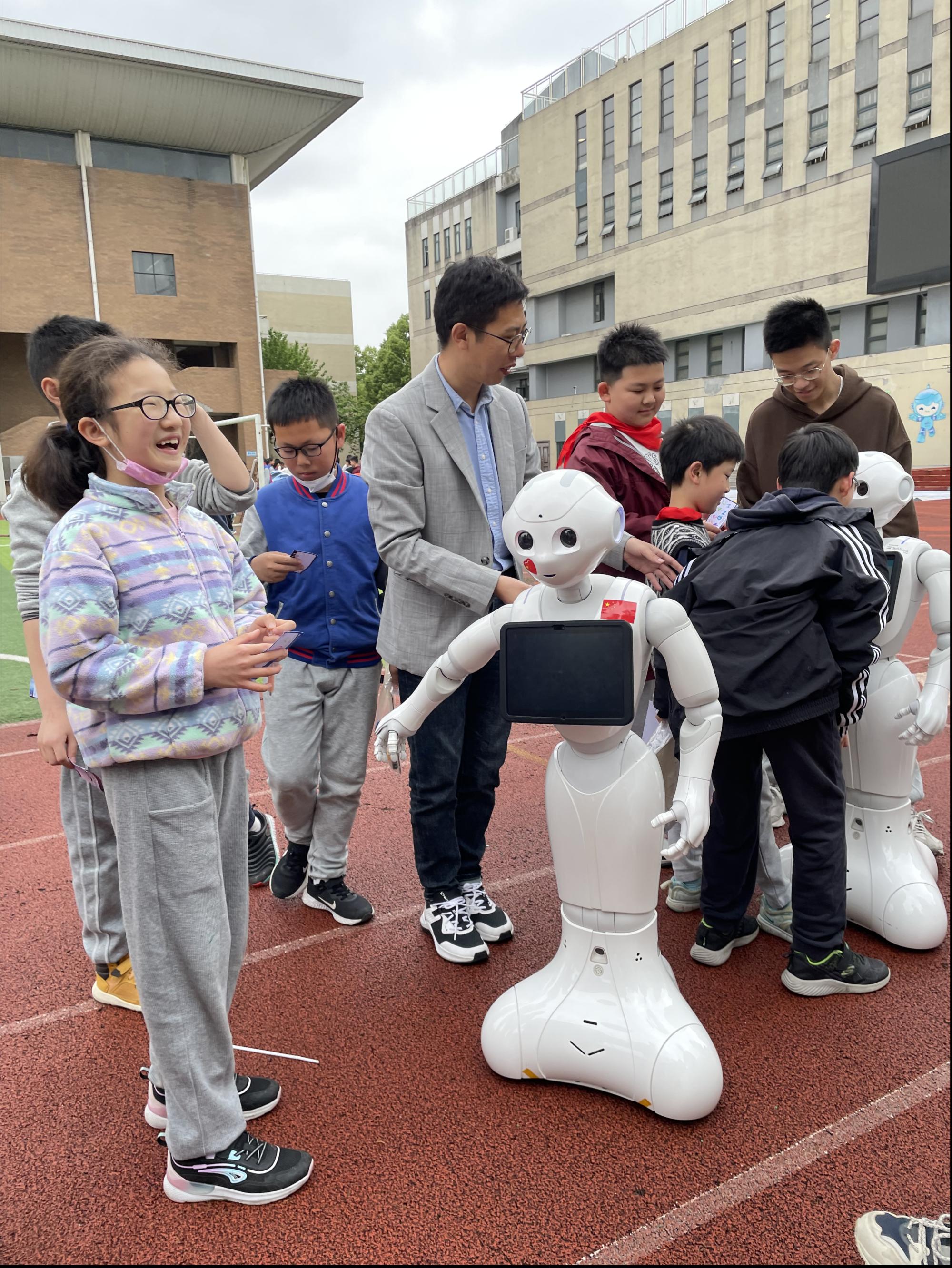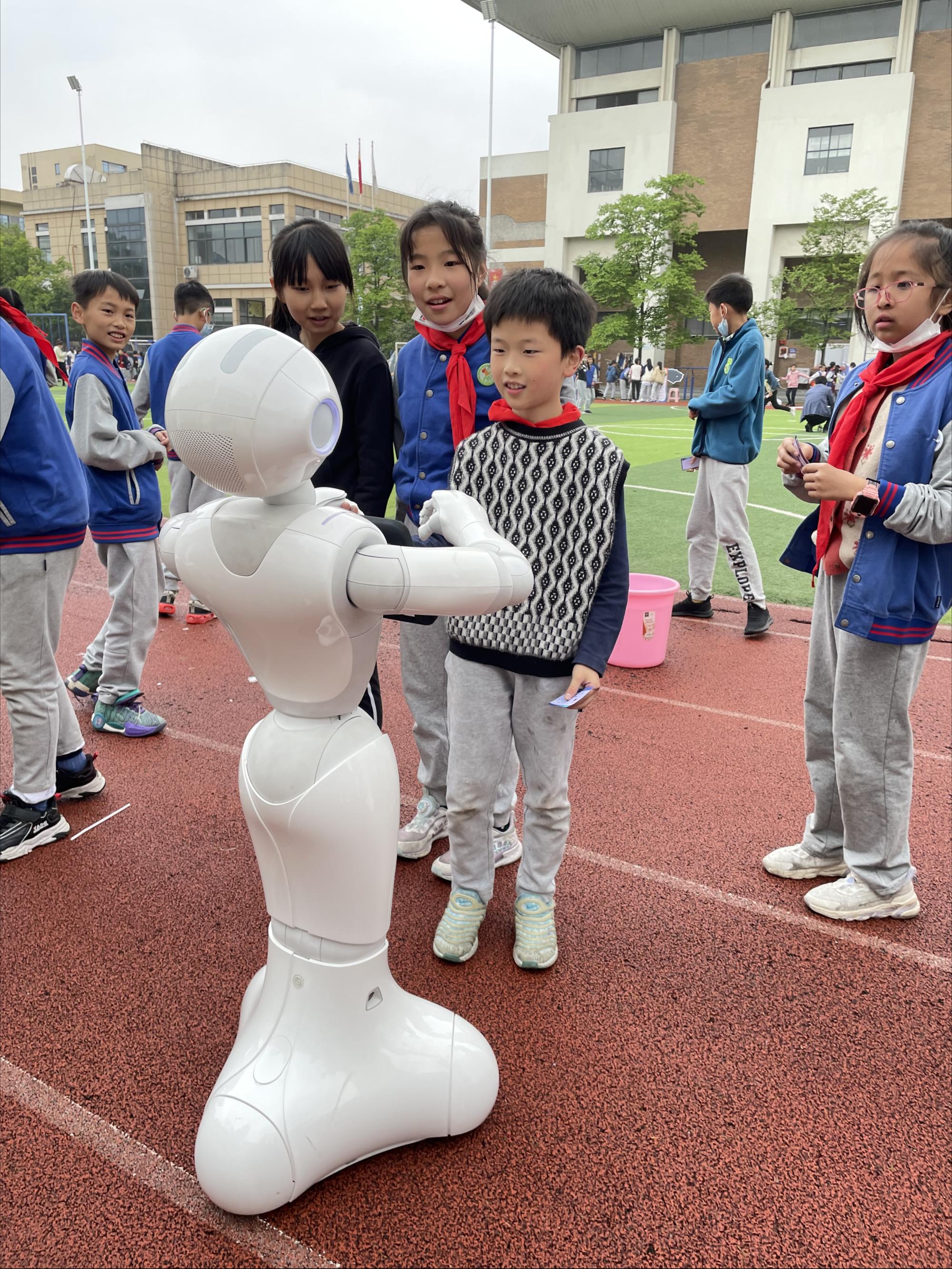 来自信智学院人工智能体验园的机器人们不仅会唱歌、跳舞、对话、握手,还会变身成为小小“党史宣讲员”。孩子们见状蜂拥而至迅速围了过来,吵着闹着要老师讲解机器人的功能,争先恐后地要跟机器人们零距离接触,来自浙江经贸职业技术学院应用工程学院的大学生志愿者们也纷纷上前与金年会老师同学交流起来。在机器人“信小智”《唱支山歌给党听》的歌舞表演声中,文海小学操场的西南角开展着一场关于人工智能教育与党史教育相融合的精彩盛宴。