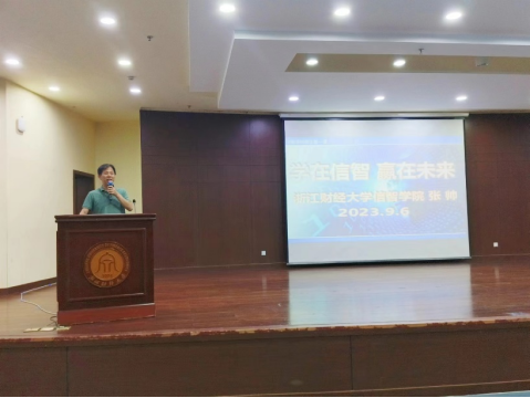 大会开始,张帅院长首先向各位23级新生的到来表示热烈欢迎,并以“学在信智 赢在未来”为主题为新生开展“开学第一课”的教育与引导。当今信息技术发展迅速,信智学院与时俱进发展潜力极大,大家已经进入新的阶段,应该更加仔细地规划未来。