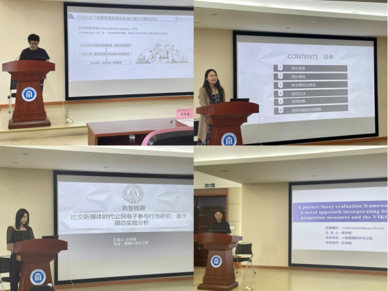 2023年9月28日下午,信智学院在9号楼302会议室成功举办了“数智钱潮”研究生论坛第2期(总第6期)。本次论坛由陈开洲、曹茜、边佳慧和陈辛格四位金年会管理科学与工程研究生进行主题分享,邀请了杨水清副教授、周莎莎副教授和吴海燕博士作此次的点评专家。学院分管研究生工作副院长隆清琦进行了开幕致辞,研究生秘书杨天亦以及全体在校研究生参加了论坛。