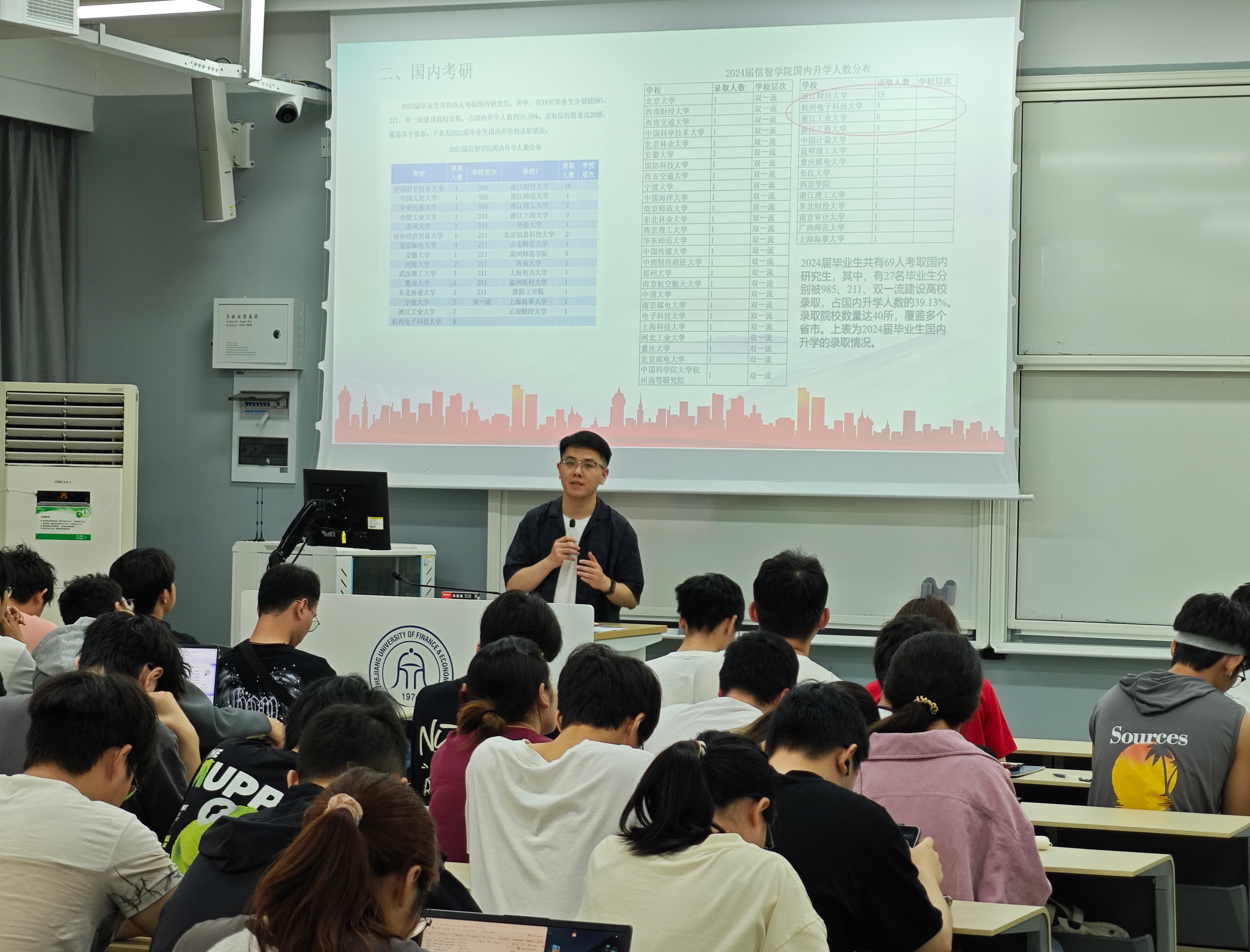 会上,朱凌老师详细介绍了考研形势,并对毕业生考研方向选择以及考研策略做出针对性指导。希望同学们能够做好考研复习计划,注重劳逸结合。吴轶韵老师以选择、心态、健康三个关键词为题,为毕业生提出宝贵建议。洪宝华老师分享了2023、2024年学院毕业生升学、就业情况,引导同学们尽早做好职业规划,明确职业方向。吴泽勇老师就毕业相关注意事项为同学们提供了丰富信息,助力学生顺利毕业。2024届升学优秀学生代表张有民、胡家赫分别从考研、出国层面分享了自己的实战经验,从学校选择、复习时间安排、学习方法、应试技巧等方面分享了心得体会。现场氛围融洽、干货满满,赢得了同学们的阵阵掌声。