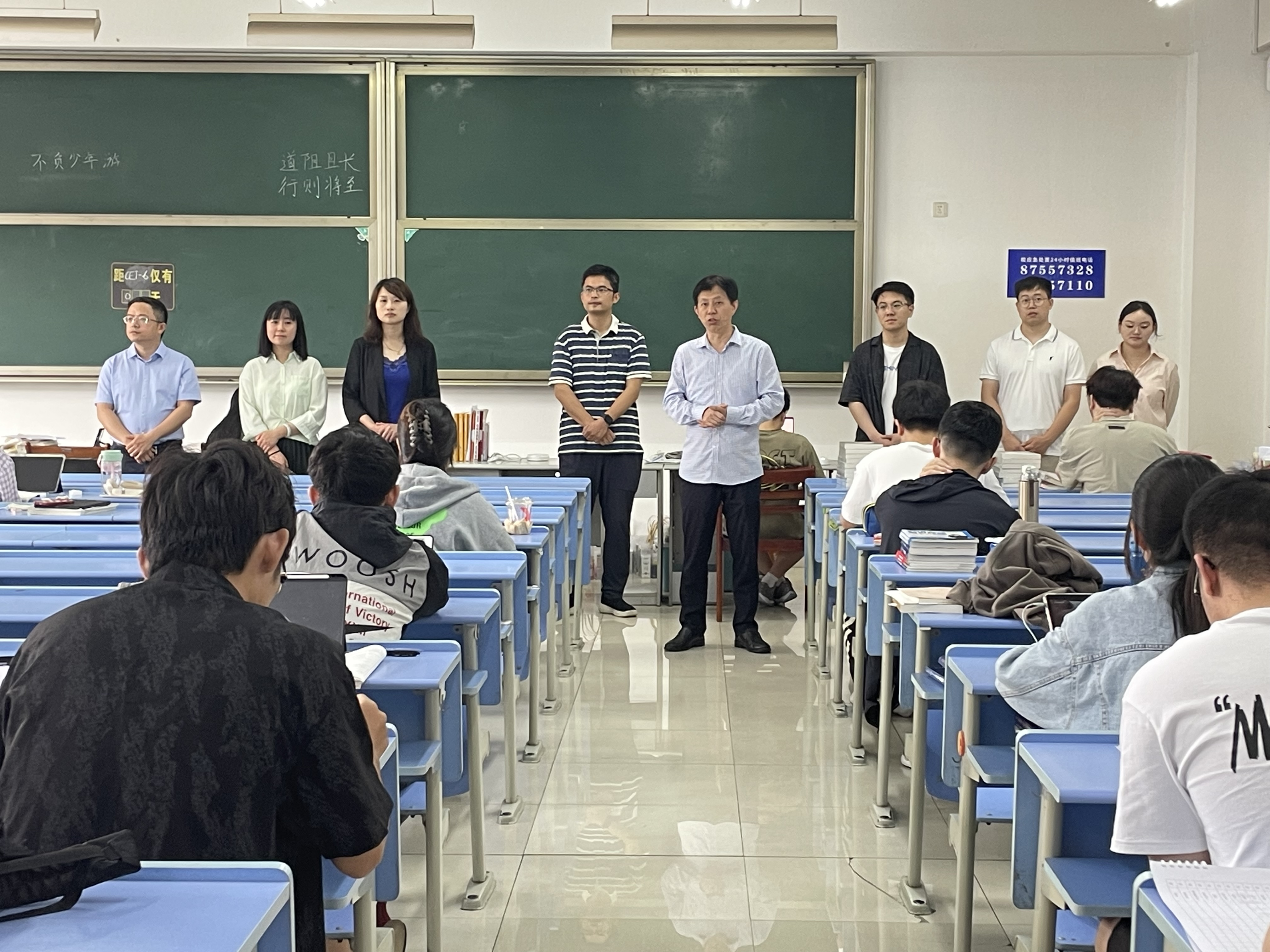 炎炎夏日的脚步悄然临近,为鼓励金年会2025届学生坚定考研信念、保持学习热情、舒缓备考压力,6月28日上午,学院院长张帅、党委书记吴翼泽、副院长林剑、朱凌、党委副书记吴轶韵及辅导员深入考研教室,为正在紧张备考的2025届学生送上关怀与祝福。