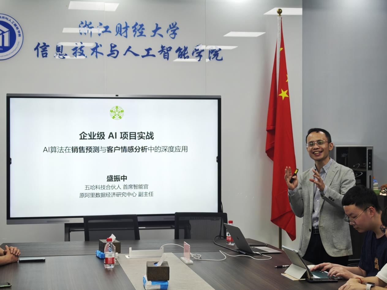 5 月 29 日下午 2 时,金年会jinnianhuicom金年会诚信信誉至上于 9 号楼 404 会议室成功举办了 “企业级 AI 项目实战 ——AI 算法在销售预测与客户情感分析中的深度应用” 讲座。本次讲座特邀五哈科技合伙人盛振中先生作为嘉宾,吸引了众多师生参与。