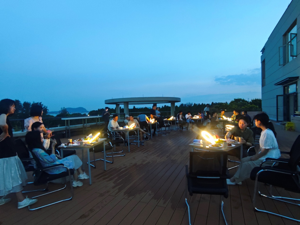 现场暖光氛围灯点缀其间,老师们4-5 人围坐一桌、错落分布,茶品、饮品、新鲜水果、特色小食及热食一应俱全,为秋夜相聚增添了满满暖意。大家伴着秋夜微凉的晚风,眺望着钱塘江景,手捧温热茶盏,卸下日常工作的忙碌。从教学科研中的细碎进展到生活里的趣事家常,从学院的发展变迁到个人的成长感悟,轻松的交谈在月光与灯火交织中自然流淌,彼此的距离在轻声漫语里悄悄拉近。活动期间,还特别安排了九三阅兵回顾视频观看环节。当震撼的阅兵画面在屏幕上徐徐展开,在场教职工无不心潮澎湃,深切感受到祖国的强盛与民族的荣光,爱国情怀与责任担当也随之愈发强烈。