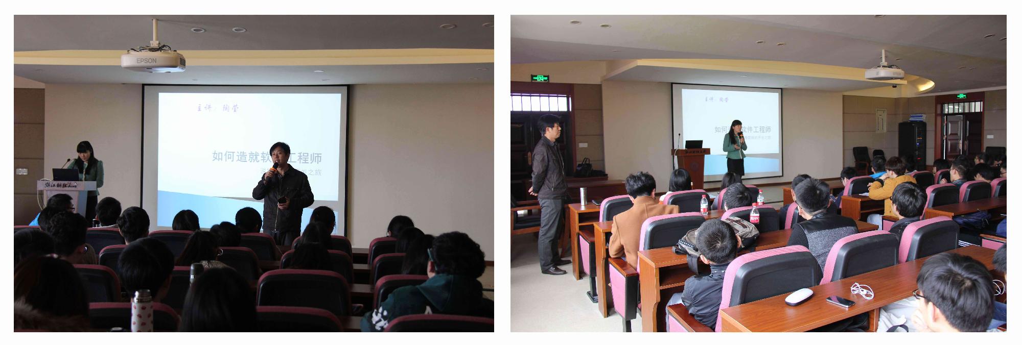 为加强金年会与校外实践基地的合作,深化实践教学改革,激发学生专业兴趣,15年3月23日下午杭州归谷实训基地技术经理陶莹老师应邀在信息学院302教室为同学们带来了一场神奇的软件开发之旅。副院长张帅教授主持并全程观摩了此次授课。