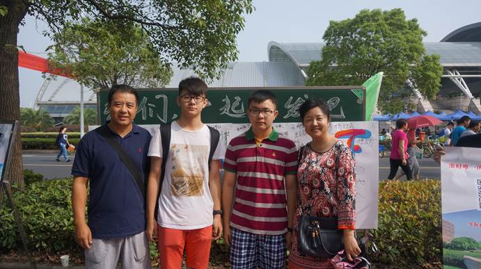 新生与家长在签名板前合影留念