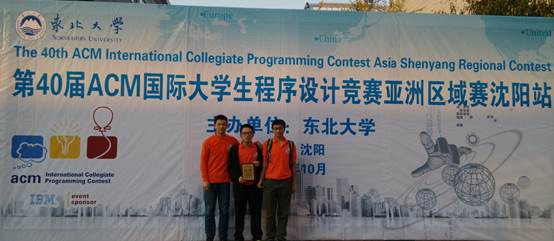 10月24-25日,第40届ACM国际大学生程序设计竞赛(ACM-ICPC)亚洲区域赛沈阳站在东北大学落下帷幕。由12软件陈铭洲、13计算机陈海杰和13软件厉伟键组成的团队在5个小时的比赛中依靠扎实的专业水平,良好的团队协作和心理素质,发挥出色,最终赢得比赛的金奖,这是我校自2009年入围该项赛事以来取得的最好成绩。