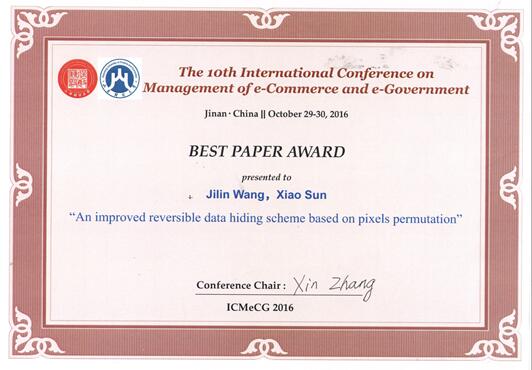 10月28日至10月30日,金年会15级管理统计学专业研究生孙啸赴济南参加了第十届电子商务与电子政务管理国际会议(ICMeCG2016),并在分论坛就“An improved reversible data hiding scheme based on pixels permutation”主题做会议报告。经过前期的论文评审和分论坛的专家组评议,包括“An improved reversible data hiding scheme based on pixels permutation”在内的5篇论文获得本次会议的最佳论文奖。