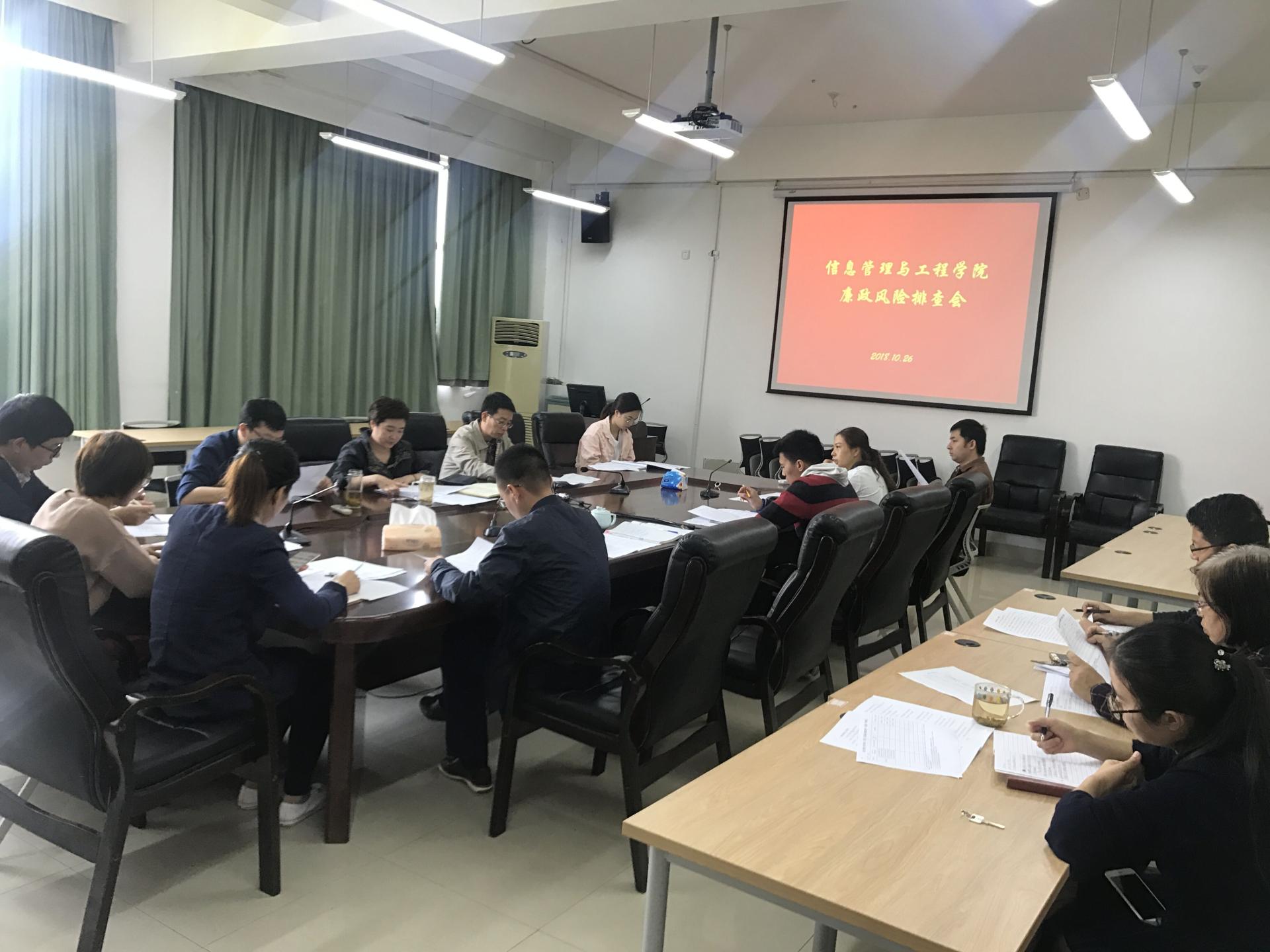 2018年10月26日,金年会召开廉政风险排查工作布置会,学院党委书记冯睿老师、党委副书记陆颋浩老师及各办公室(中心)全体成员参加了此次会议。
