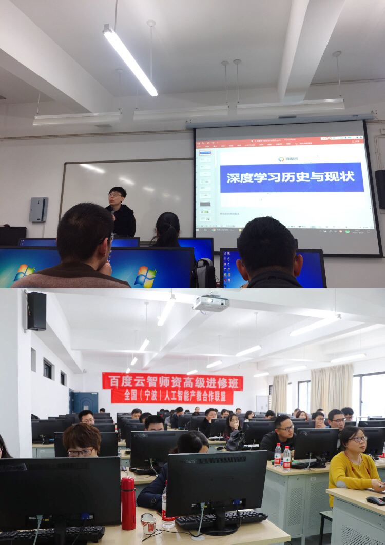 2019年4月12日-14日,信工学院陈圆圆等老师参加了百度云智学院主办,中国(宁波)人工智能产教联盟和百度云智学院宁波分院(宁波青软智能科技有限公司)联合承办的为期三天的人工智能研究与教学培训。培训主要邀请了国家教学名师王万良教授和百度深度学习布道师白浩杰博士分别从人工智能理论和实战两方面进行培训。