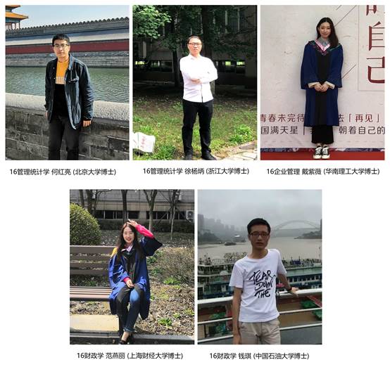 近日,各高校陆续公布了2019年博士研究生招生录取名单。我校A类科研创新团队—经济数据挖掘与智能决策创新团队协同培养的首届516级硕士研究生何红亮、徐杨炳、戴紫薇、范燕丽、钱琪全部成功考取了北京大学、浙江大学、华南理工大学、上海财经大学、中国石油大学等985/211名校的博士研究生,考博率达100%