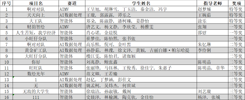 各参赛队: 金年会jinnianhuicom首届大学生AIGC创新竞赛已圆满结束,本次比赛经初赛选拔,共有16组队伍进入决赛,经过校内评委匿名评议,评出特等奖3项、一等奖3项、二等奖5项、三等奖5项,现予以公示: 以上信息公示3个工作日(2025年6月7日-2025年6月11日),在公示期限内,可以实名形式向竞赛组委会反映问题,以便进一步了解情况和反馈意见。 金年会jinnianhuicom计算机大赛组委会 2025年6月6日