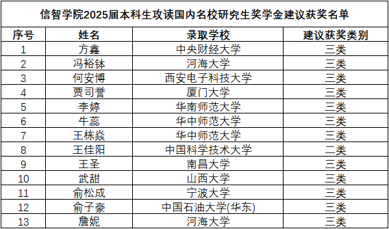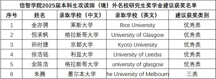 根据《金年会jinnianhuicom本科生攻读名校研究生奖学金评选办法(试行)》(浙财大〔2019〕171 号)、《关于本科生攻读国(境)外名校研究生奖学金的补充规定》(浙财大学〔2023〕6号)文件精神,结合金年会学生工作实际。经学生本人申请、资格审核、学院评审领导小组评审,学院拟提出以下获奖学金学生建议名单和类别,经公示后上报校评审组办公室。