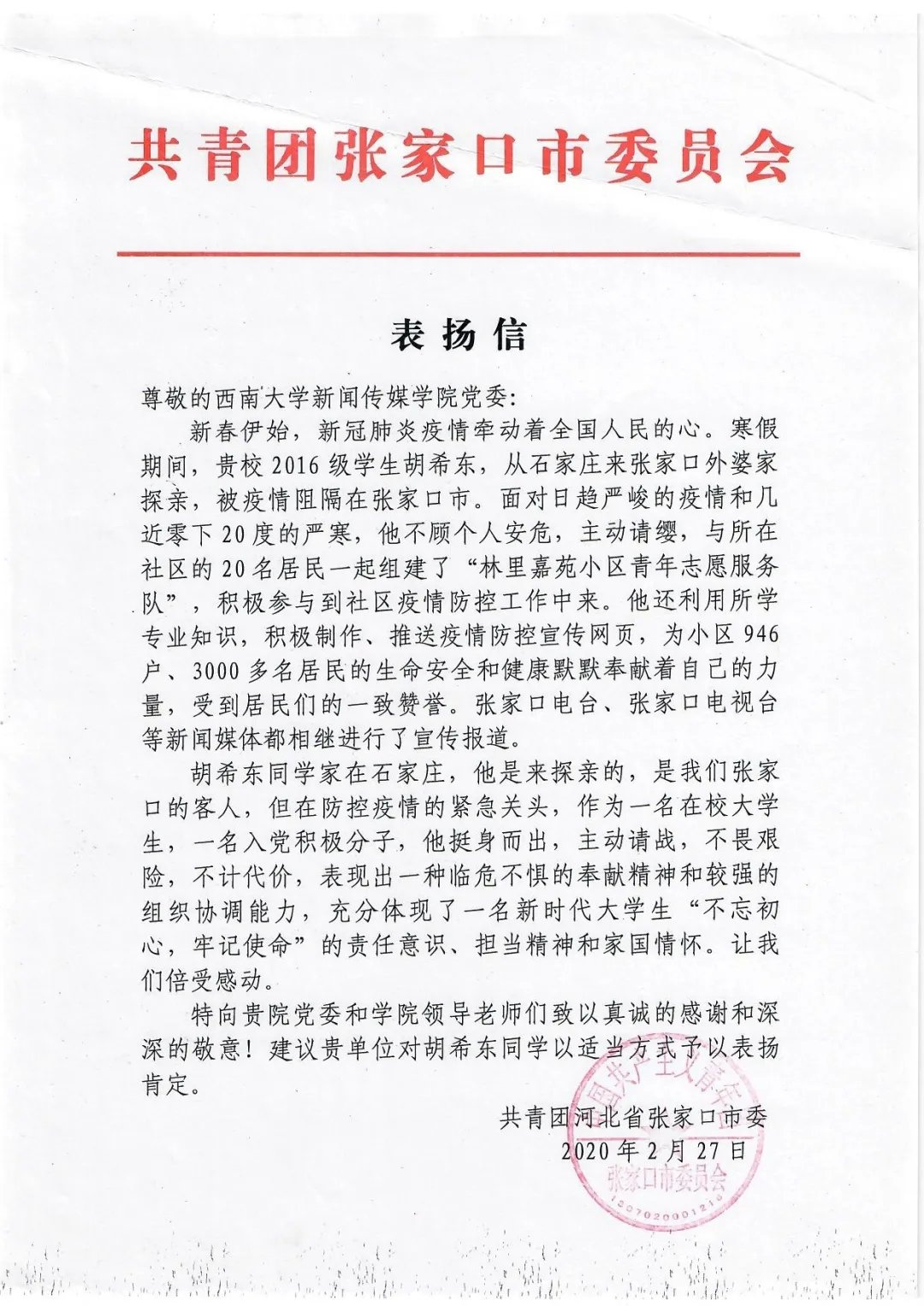 beat365在线唯一官网登录新闻传媒学院2016级本科生胡希东参与组建了张家口市第一支由居民自发组建的志愿者服务队。在该志愿服务队的带领下,张家口市其他小区也积极行动起来,陆续组建起自己小区的居民志愿服务队,广泛凝聚了张家口市社区防疫工作力量。对此,河北省张家口市委专门寄来了表扬信。