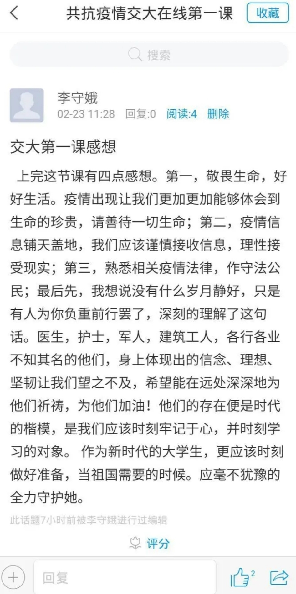 学校马克思主义学院组织成立专题课程组,采用分工与协同并举的方式进行网上集体备课,教师精诚协作,课程谋划充分,教学组织得当,井然有序,课程效果良好,学生反响强烈。课程讨论区共收到6.5万余条交流发言,平均每位学生发表评论近3条,学生总体到课率93.26%,课程获得了5.0分好评。开学第一课的专题教学形式新颖、内容丰富,唤醒了大学生在疫情面前对生命的敬畏与思考,明晰了新时代大学生应有的理想信念与责任担当,也展示了交大思政课教师为共抗疫情做贡献的教学初心与育人情怀。