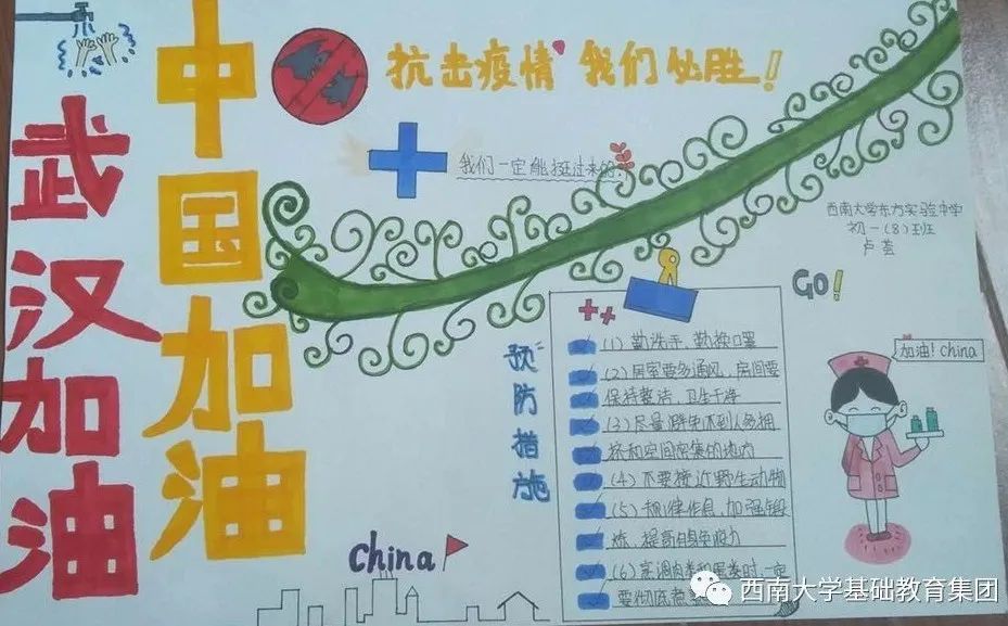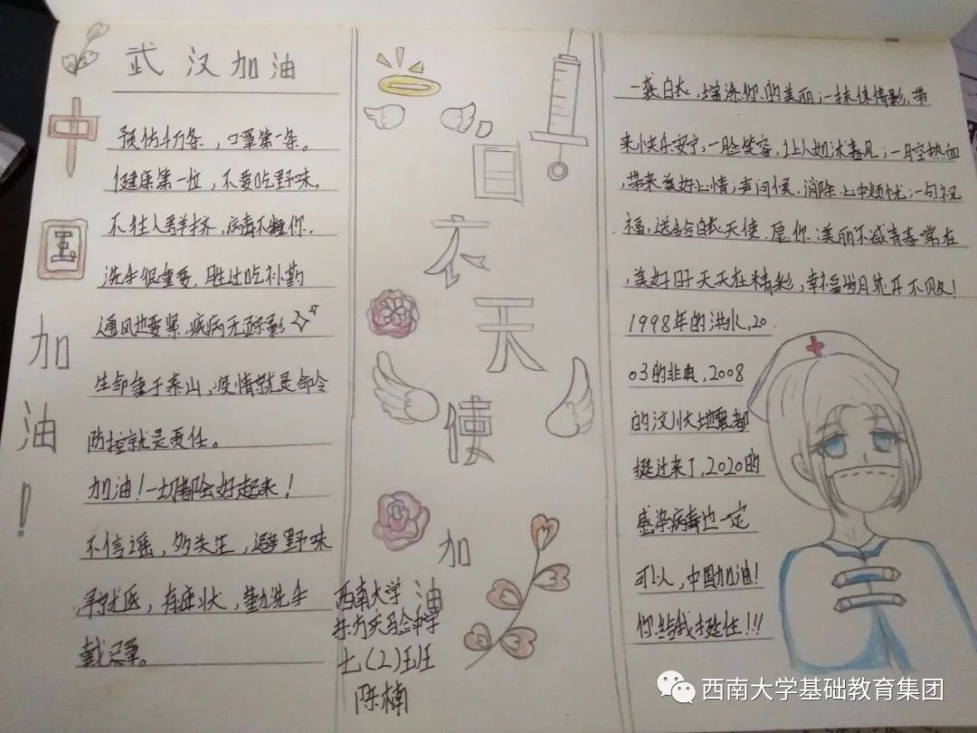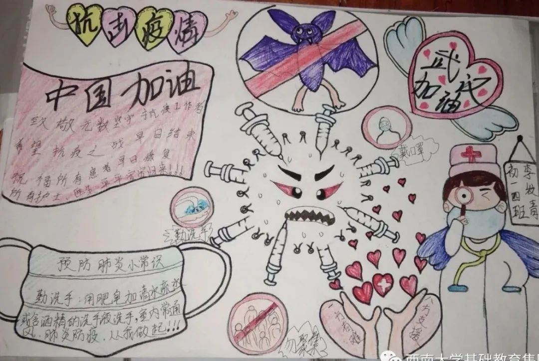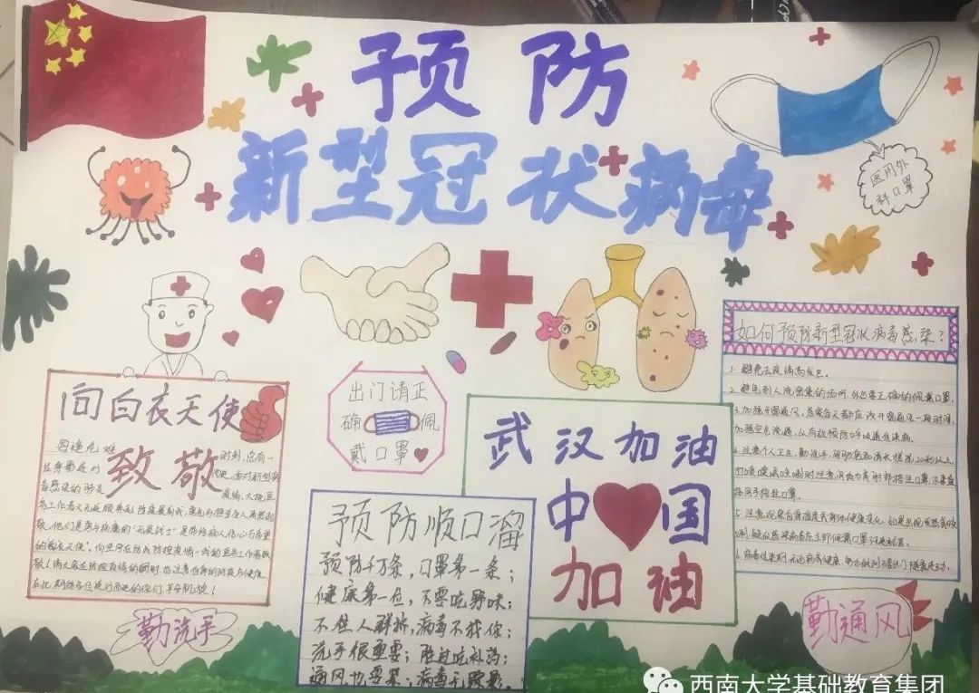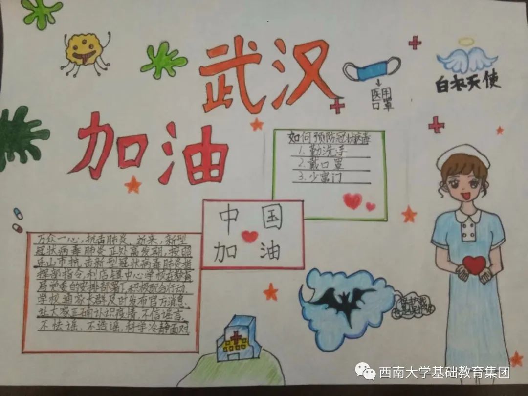 ●作品介绍:该手抄报作品展示了防疫小措施以及用自己的手段对可爱的白衣天使致以崇高的敬意。可爱的白衣天使们塑造的真的很可爱。