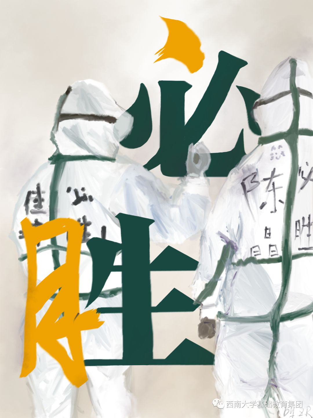 画中有两个大字,有两个背影。背影意味着默默无闻的做事情,踏实实干,做出努力,给国人以战胜疫情的决心和信心。“必胜”二字在画面中一共出现了三次,每次出现的笔法和字体都不一样,有的风格偏成熟,有风格偏向稚嫩。画面元素错落有致,层次感强烈。“我们”来自不同的省份,“我们”来自不同的家庭,但“我们”齐心协力,必定获胜。