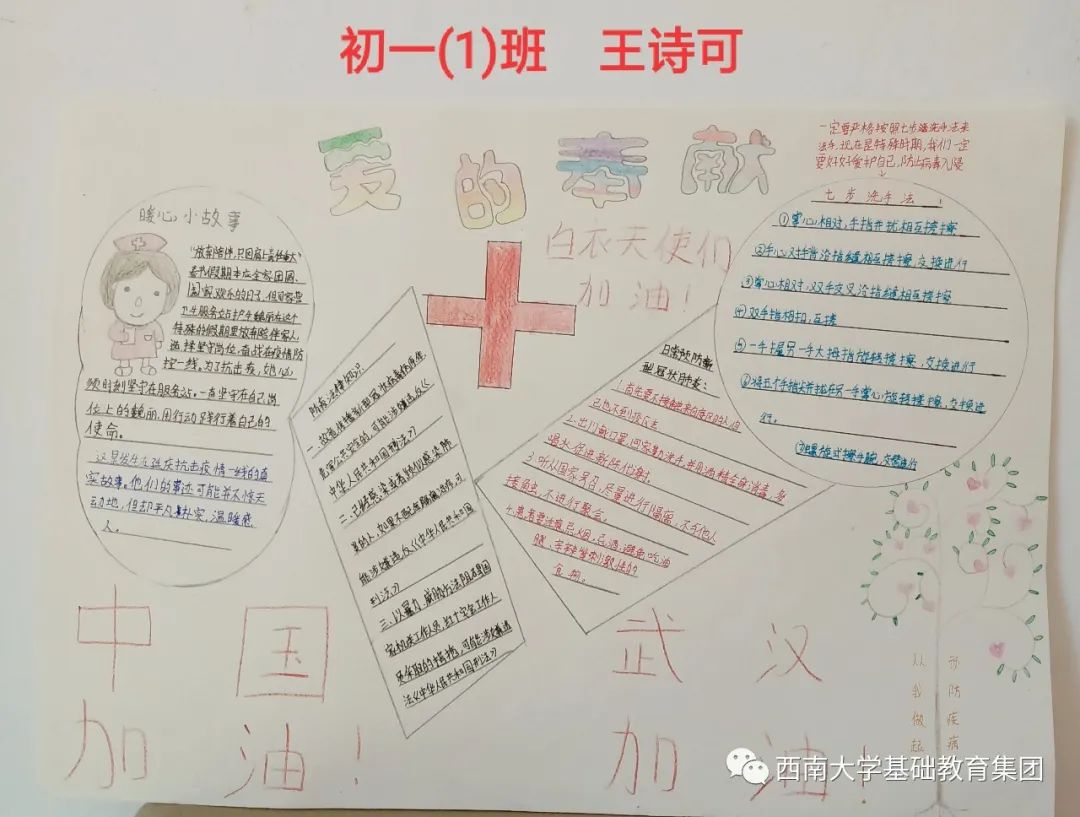●作品介绍:画面整体上看来有一种淡淡的感觉,虽然用色有些不太饱满,但是看起来还是挺舒服的。该手抄报书写了暖心的小故事以及七步洗手法等日常防护措施。“中国加油,武汉加油。"