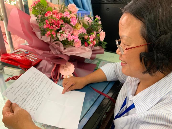 “阿姨,今天是您上班吗?一会有人来送东西,您帮我收一下呗。”5月9日一大早,beat365在线唯一官网登录学生宿舍——李园5舍的值班员杨跃洪就收到517寝室物理科学与技术学院2017级学生董思佳的消息。即将开校复学,这两天宿管阿姨收到学生们请求帮忙收快递的短信很平常。“我以为是快递,要开学了嘛,这几天宿舍群里孩子们可激动了!”出乎意料的是,杨阿姨等来的是一束送给她的鲜花和一封亲笔信。