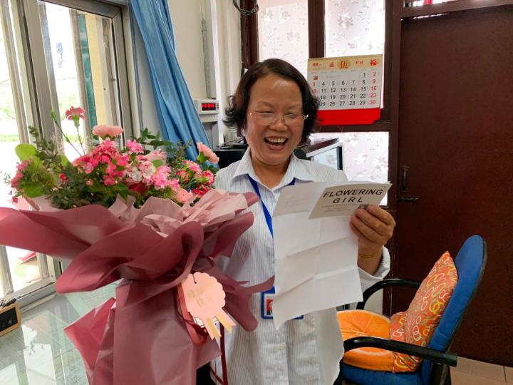 今年50出头的杨跃洪,孩子已经工作,原计划干完这个暑假就退休的,因为疫情防控需要,担心学校不好新招后勤员工,所以就留了下来。“她们比我的孩子还小几岁,如果孩子在外地读书,这么久不去,我也会担心这些,帮忙收拾收拾也没啥。没想到她们会送花给我,特别激动,特别开心!”