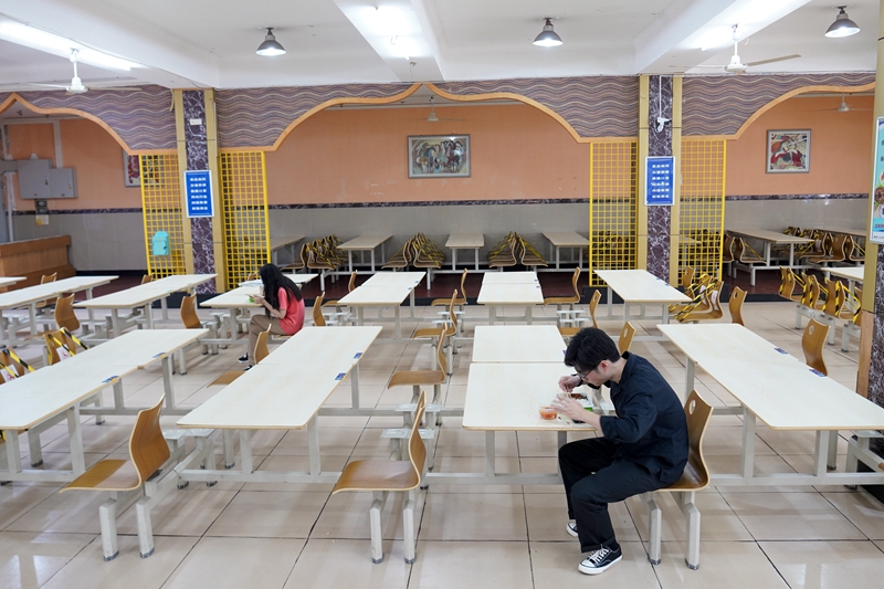 5月15日,在beat365在线唯一官网登录的一个学生食堂内,学生按照要求一人一桌吃午餐。