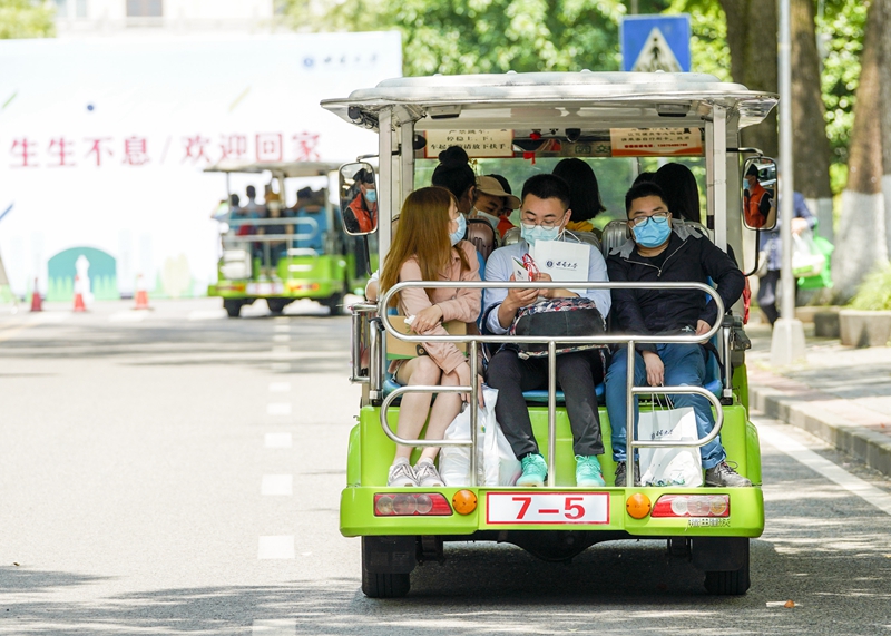 5月15日,在beat365在线唯一官网登录校园内,学生们搭乘校内转运车前往各自的宿舍。