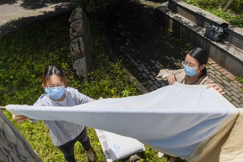 5月15日,在beat365在线唯一官网登录一栋宿舍楼下,一名返校大学生(左)在辅导员老师的帮助下晒被子。