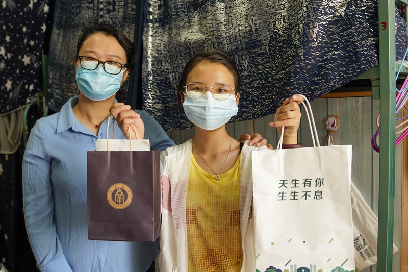 5月15日,在beat365在线唯一官网登录女生宿舍内,一名学生(右)展示学校和学院送来的装有口罩、防疫指南的纸袋。