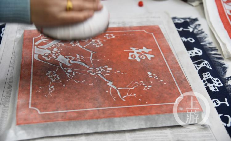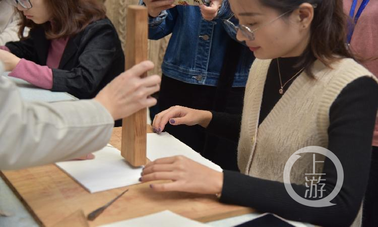 在一片此起彼伏的敲击声中,杨晓薇同学结束了15分钟的传拓体验,擦了擦额头上的汗。 “看似只要不断敲击拓板,实则可是个体力活儿呢!”她笑称,从平铺宣纸到扑拓排气,从拓墨拓色到揭纸晾干,每一步都需要耐心专注的发力,才能使拓印纹路清晰、颜色均匀、立体感强。“柔韧的宣纸、雕刻书法艺术、传拓技艺,小小的拓印处处凝结着古人的智慧,而这些都值得我们青年人学习传承。”她感慨地说到。