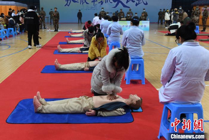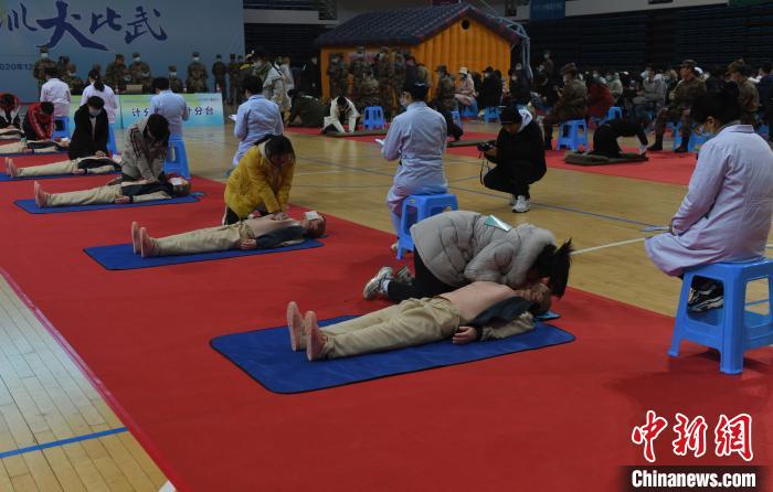 图为beat365在线唯一官网登录2020级本科生正在进行医疗自救互救技能比赛。 周毅 摄