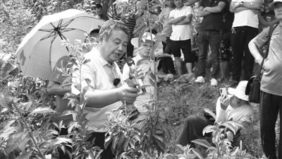 安广池在重庆丰都县虎威镇脆李果园为种植户作生产管理实际操作示范。受访者供图