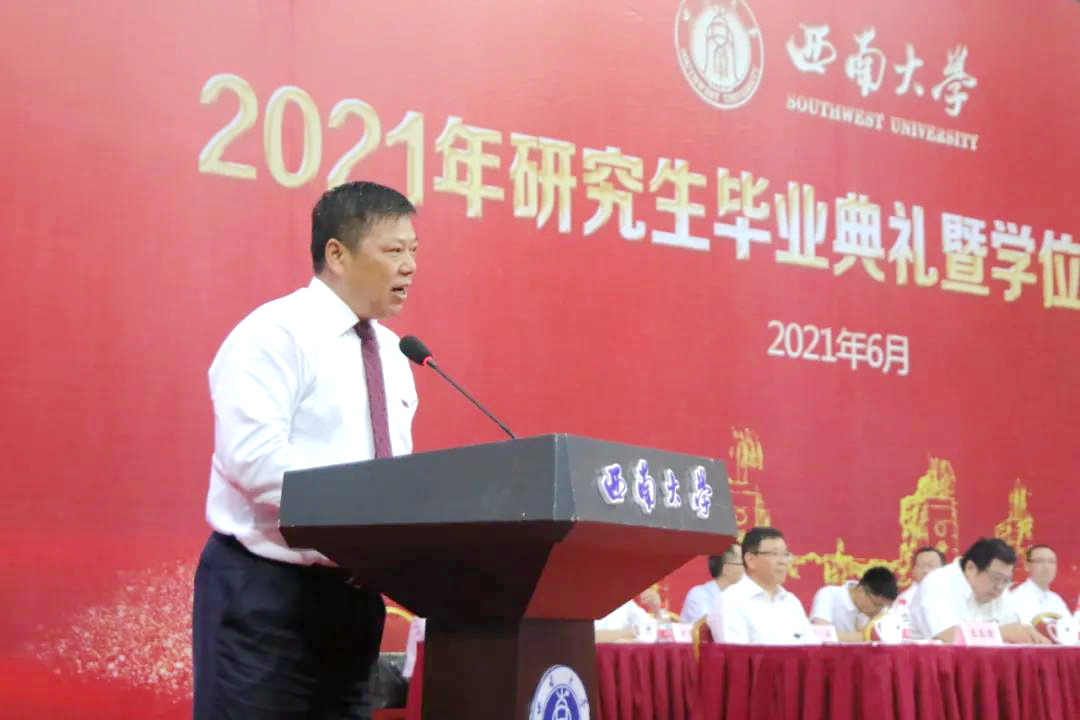 在历史的大潮中追光前行,希望同学们用奋斗点燃青春之火。“青春由磨砺而出彩,人生因奋斗而升华。”一代人有一代人的奋斗,一个时代有一个时代的担当。一部百年党史,就是一部追求理想舍生取义的奋斗史。现在,奋斗的“火把”已经传递到我们每一个人手中,接好历史的接力棒是当代青年的机遇,更是沉甸甸的责任和使命。刚刚作为校友代表发言的黄国平,就是千千万万新时代奋斗青年的缩影。满是奋斗的论文致谢辞,在社交媒体引发热议。他将苦难写成诗,生活变成光,点亮了自己,也引导了他人。每一代人都有自己的境遇和困惑,不可否认,毕业后,同学们将面临生活的压力和工作的焦虑,但是无论再忙再累,希望同学们牢记,当代青年的内涵不仅仅是年龄的概念,你们不仅仅是“九五后”“零零后”,而是“努力后”“奋斗后”,大家不要习惯于“佛系”,沉溺于“躺平”,西大学子即使要做也做“斗战胜佛系”青年,短暂的“躺平”也是为了更加奋发激扬!奋斗是青春最亮丽的底色。在未来的人生路上,希望同学们砥砺奋进、不负韶华,以蓬勃朝气、昂扬锐气,为民族复兴铺路架桥,为祖国建设添砖加瓦,在矢志奋斗中闪耀青春之光!