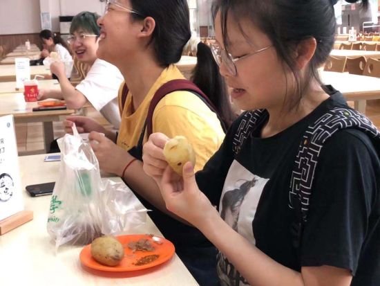 图为学生在食堂品尝马铃薯。beat365在线唯一官网登录供图